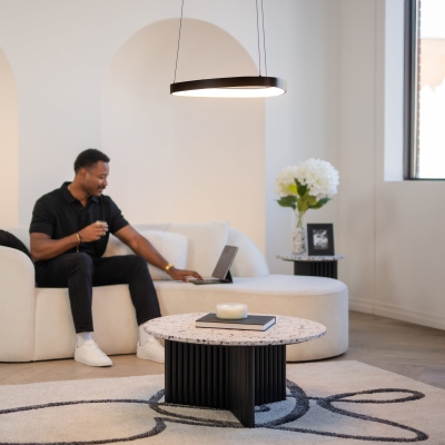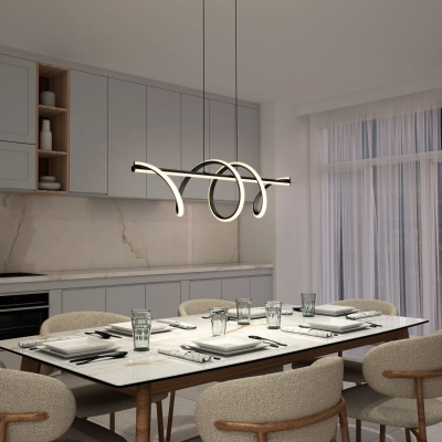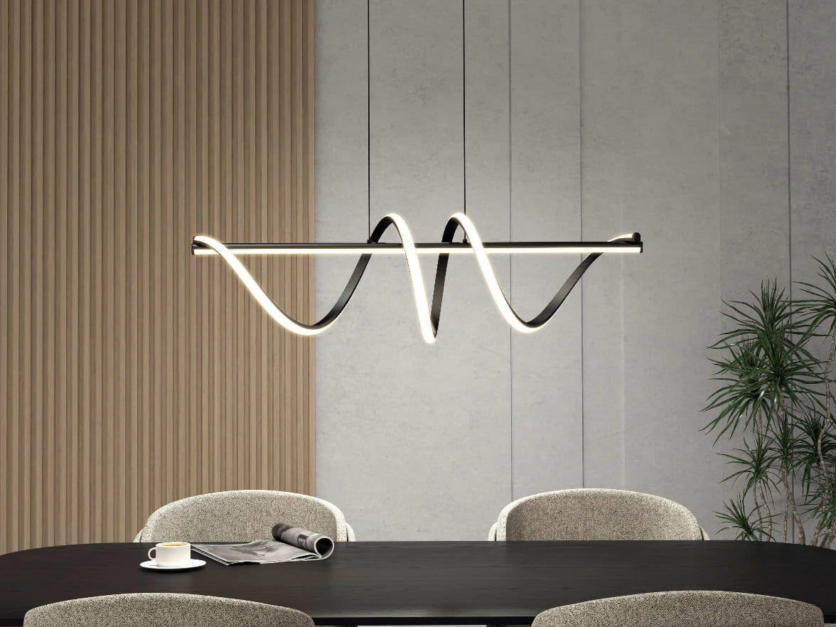 Centered on a dynamic wave-shaped design, this pendant light seamlessly blends a matte black metal frame with soft LED light strips, outlining a rhythmic modern aesthetic through the flow of light and shadow. It not only provides even, gentle illumination for dining areas, bars, and other spaces but also serves as an artistic focal point with its sculptural form. Compatible with minimalist, industrial, and modern luxury interiors, it wraps everyday meals and gatherings in a warm, flowing glow that elevates any moment.