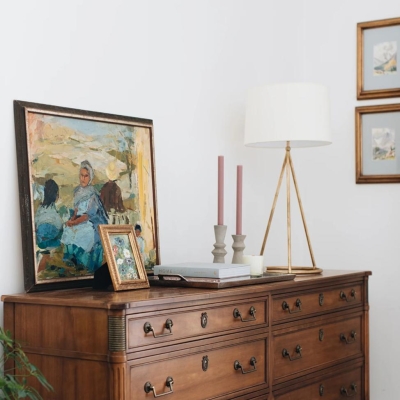 Brass tripod stand paired with a simple fabric lampshade, blending vintage texture with modern lines to infuse your space with warm, elegant literary charm.